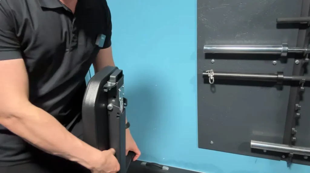 He also mentions the wall-mount option. While he humorously admits he didn’t install it properly and simply leaned it against wall-mounted bars, the point remains clear: this bench is designed for people training in apartments or shared living spaces where storage matters.