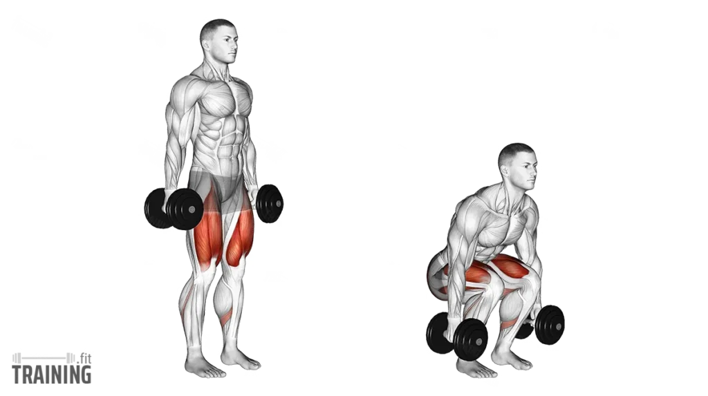 Hold the dumbbells at your sides or at shoulder height and squat down, keeping your back straight and chest up.Single-Leg Deadlifts – 15 reps